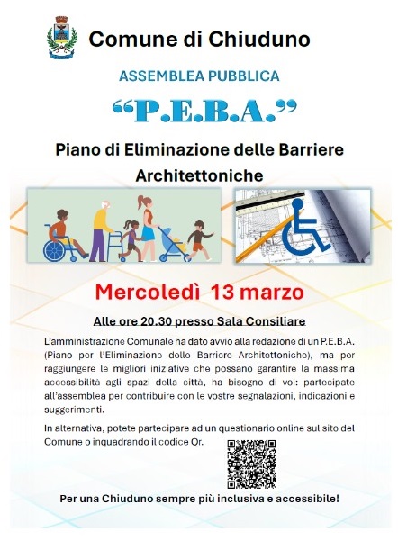 L’Amministrazione Comunale di Chiuduno ha recentemente dato avvio a un percorso che porterà alla redazione di un Piano per l’Abbattimento delle Barriere Architettoniche, detto P.E.B.A e a un P.A.U. Piano di Accessibilità Urbana, con lo scopo di valutare le iniziative da intraprendere per garantire la massima accessibilità agli spazi ed ai luoghi pubblici del paese.